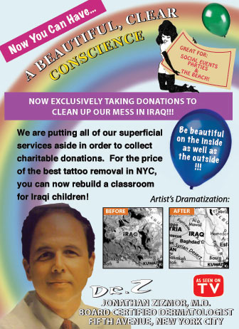 Also, satire can successfully pierce into difficult and/or complex subjects where other approaches won’t work. It can isolate qualities in a social system (like advertising) that would be difficult to discuss verbally. For example, with the “ads” in the special edition New York Times and New York Post, I really wanted to distill the utter strangeness of this alternate consumer reality — to put that weirdness in a bottle and really study it! The Dr. Zizmor ad is perhaps the most successful example of this. Strange ads are a great inspiration and a great source of unintentional comedy that it simultaneously very illuminating. For example, next time that you are bored, search YouTube “Franky and Johnny’s Special Man” which is a truly bizarre TV commercial from 1980’s New Orleans — it clarifies so many things about consumer culture. Its these discarded and uncomfortable bits of overlooked (ignored?) culture that really get to the heart of things quickly – like a window to the social id.