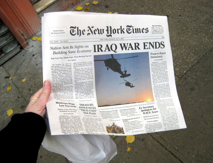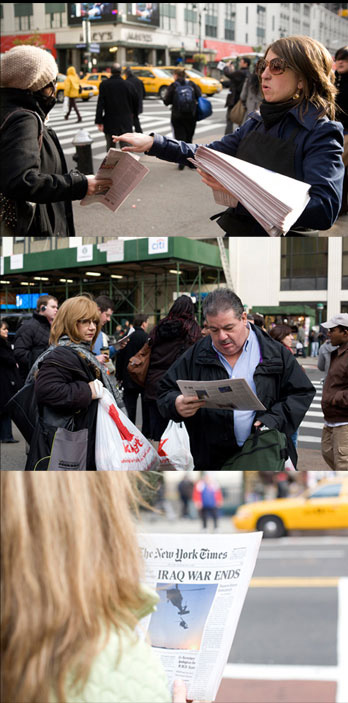 Daniel and I get brought into the projects which necessitate some degree of delicately-calibrated visuals. So the New York Times and New York Post projects were perfect for our involvement, we could really shine there — obsessing over typefaces, crafting fantasy advertisements from the post-corporate utopian future, dealing with printers, etc. Although we attended some initial conceptual meetings, the writers worked on the respective papers for months before the project moved (quite literally) over into our apartment. I basically had carte blanche with the ads — Daniel worked primarily on the layout of the paper, but we both tinkered. And of course, it is very fulfilling to work on projects that are this interactive. We could get both solicited and unsolicited feedback immediately during distribution. It has all been pretty magical thus far– it spite of being a ton of work with an uncertain outcome/reception. There were moments at 5am when there was real worry in the room, but both paper projects turned out really well.