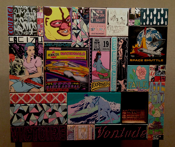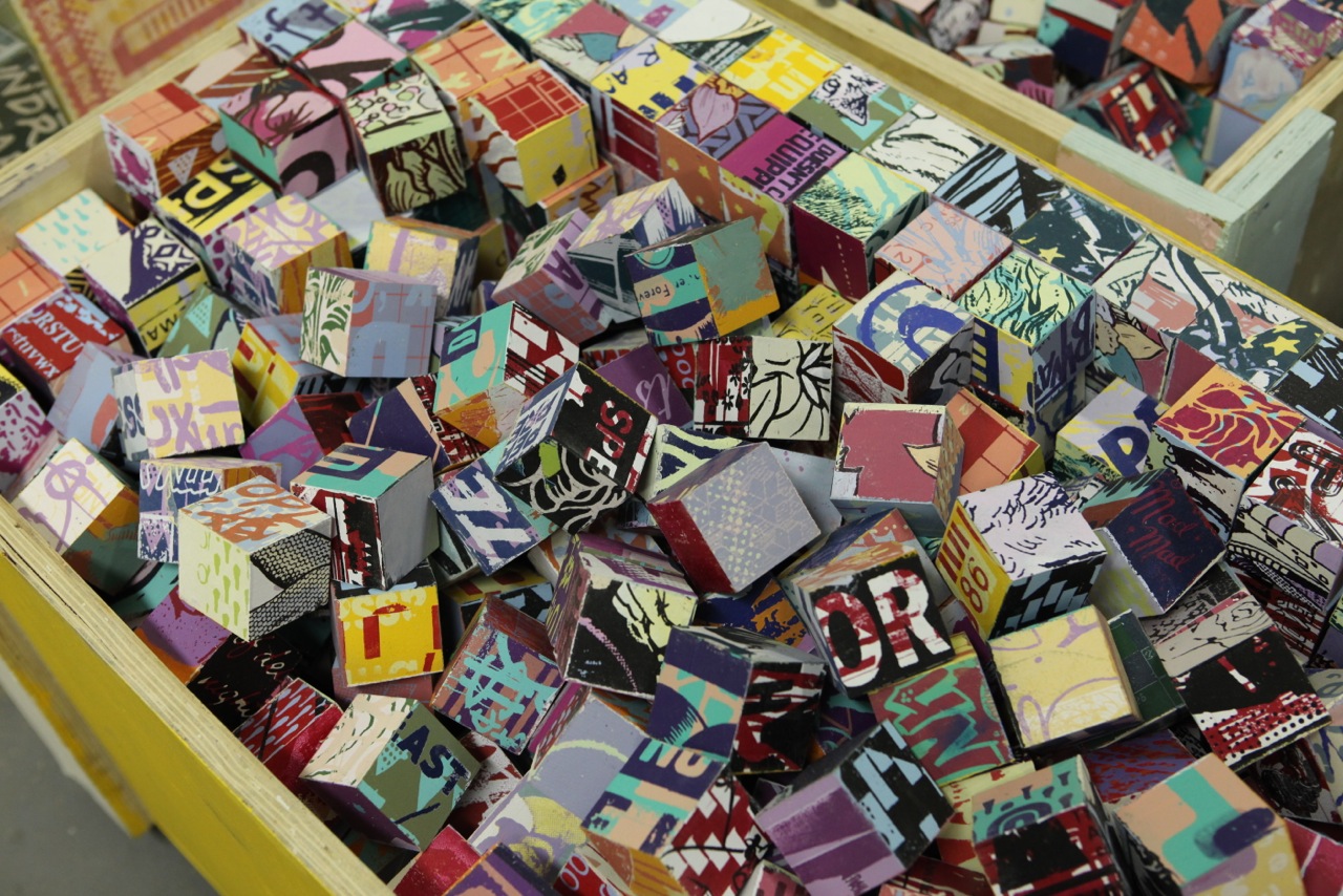 “We’ve always been working in the studio while working in the street,” he continued later. “The first apple box we ever found was in the street – it was leftover from a film set, they forgot it or something – in Williamsburg. We said, ‘Shit, this is a really beautiful box’ and we brought it into the studio and painted it and printed it and started just stacking them – small stacks and big stacks – and eventually that led to this. You find a lot of things just stumbling across the landscape.”