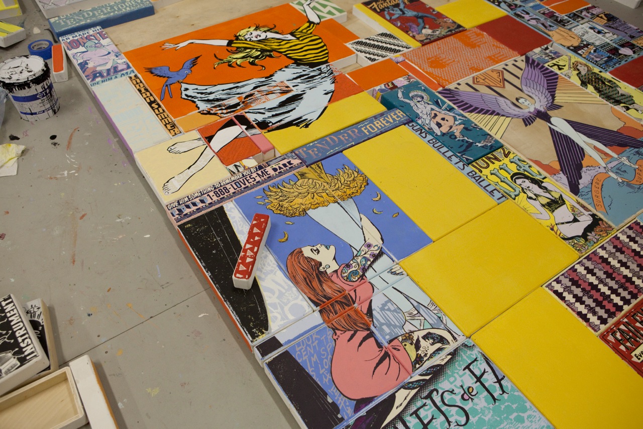 “If you don’t have a timeline it’s really hard to work in a lot of ways,” Patrick told us as we were wrapping up. “Like downstairs [on the mezzanine] we couldn’t hang the paintings, so we had to make stands for them to be on, and all of a sudden it was like, ‘Wow this totally looks like much more sculptural paintings, we can put them back to back or anywhere’ so all those things led to that.